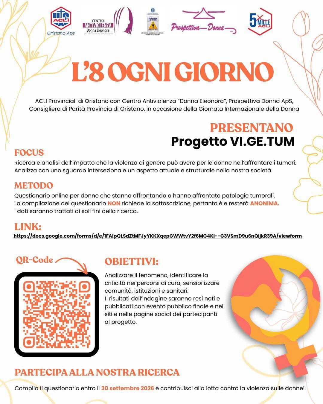 La Consigliera di Parità della Provincia di Oristano ha concesso il proprio patrocinio all’iniziativa VI.GE.TUM, progetto di ricerca promosso in Sardegna per approfondire il rapporto tra il vissuto di violenza di genere e il percorso di cura delle donne che affrontano patologie oncologiche.